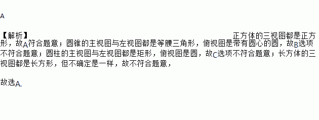 A 【解析】正方体的三视图都是正方形,故A符合题意;圆锥的主视图与左视图都是等腰三角形,俯视图是带有圆心的圆,故B选项不符合题意;圆柱的主视图与左视图都是矩形,俯视图是圆,故C选项不符合题意;长方体的三视图都是长方形,但不确定是一样,故不符合题意, 故选A.