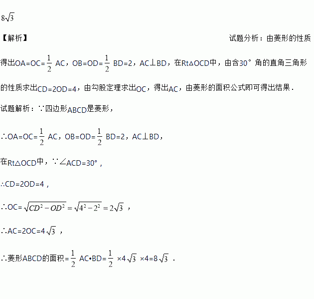 如图,四边形ABCD是菱形,对角线AC,BD相交于点O,且∠ACD=30°,BD=4,求菱形ABCD的面积.