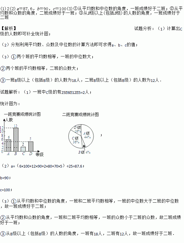 )6月5日是世界环境日,某校组织了一次环保知识竞赛,每班选25名同学参加比赛,成绩分别为A、B、C、D四个等级,其中相应等级的得分依次记为100分、90分、80分、70分,学校将某年级的一班和二班的成绩整理并绘制成如下统计图: