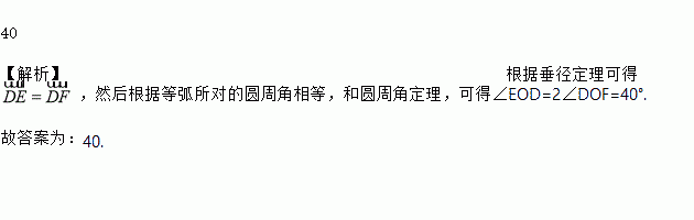 如图,⊙O的直径CD⊥弦EF于点G,∠DCF=20°,则∠EOD=______°;