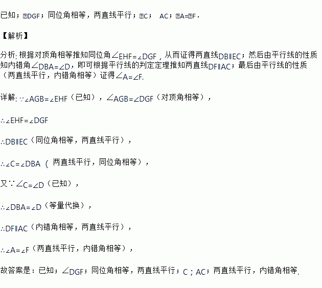 如图,点B、E分别在直线AC和DF上,若∠AGB=∠EHF,∠C=∠D,可以证明∠A=∠F.请完成下面证明过程中的各项“填空”.