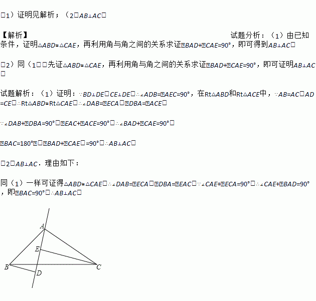 (2)若B、C在DE的两侧(如图2所示),其他条件不变,AB与AC是否垂直吗?若垂直请给出证明;若不垂直,请说明理由.