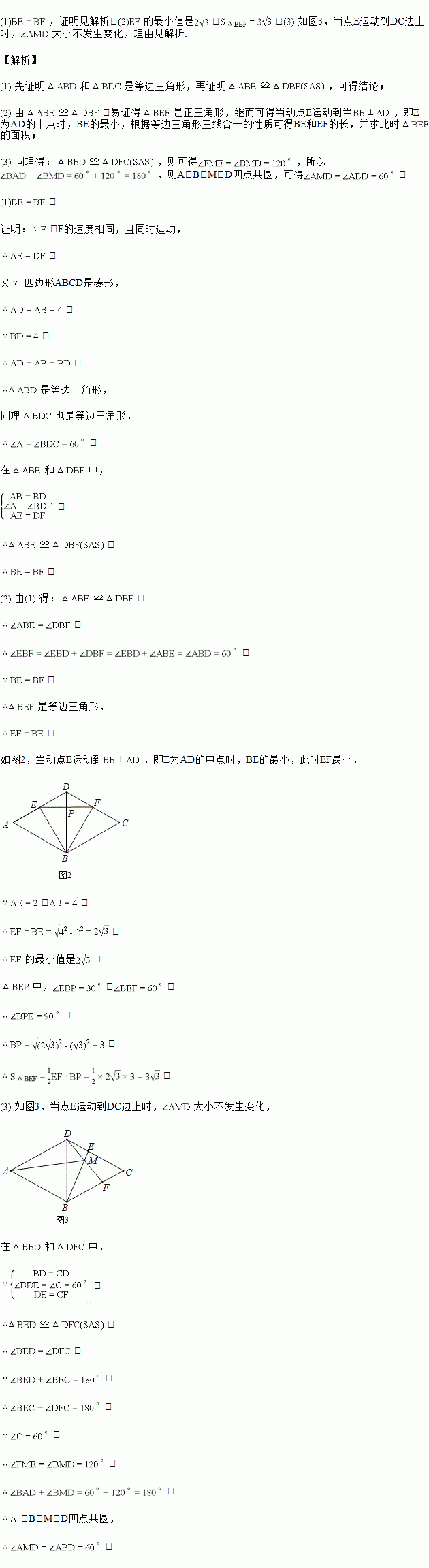 如图,已知菱形ABCD边长为4,,点E从点A出发沿着AD、DC方向运动,同时点F从点D出发以相同的速度沿着DC、CB的方向运动.![]()