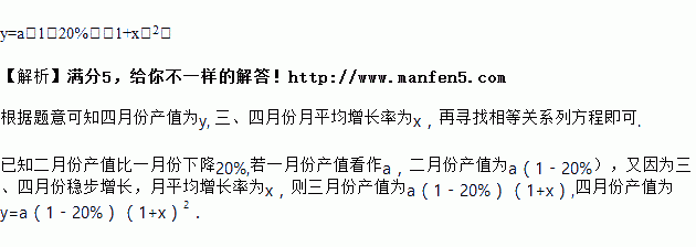 某企业因生产转型,二月份产值比一月份下降20%,转型成功后生产呈现良好上升势头,三、四月份稳步增长,月平均增长率为x,设该企业一月份产值为a,则该企业四月份的产值y关于x的函数关系式为_____