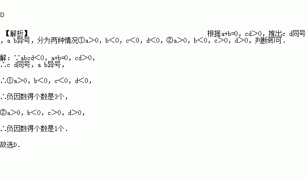 如果abcd<0,a+b=0,cd>0,那么这四个数中负因数的个数至少有( )