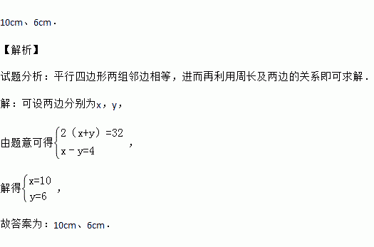 在?ABCD中,两邻边的差为4cm,周长为32cm,则两邻边长分别为 .