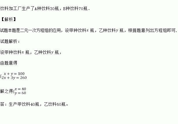 食品安全是关乎民生的重要问题,在食品中添加过量的添加剂对人体健康有害,但适量的添加剂对人体无害而且有利于食品的储存和运输.为提高质量,做进一步研究,某饮料加工厂需生产A、B两种饮料共100瓶,需加入同种添加剂270克,其中A饮料每瓶需加该添加剂2克,B饮料每瓶需加该添加剂3克,饮料加工厂生产了A、B两种饮料各多少瓶?