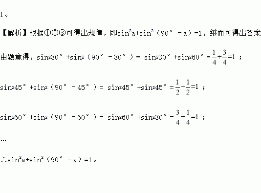 根据上述规律,计算sin2a+sin2(90°﹣a)= .