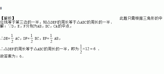 8 【解析】此题只需根据三角形的中位线等于第三边的一半,知△DEF的周长等于△ABC的周长的一半. 【解析】 ∵D,E,F分别为AB,BC,CA的中点, ∴DE=AC,DF=BC,EF=AB, ∴△DEF的周长等于△ABC的周长的一半,即为. 故答案为:6.