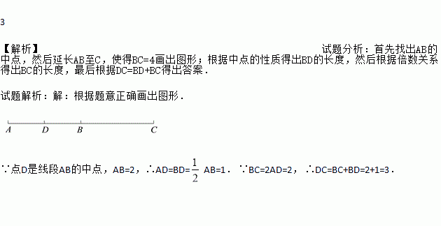 已知:线段AB = 2,点D是线段AB的中点,延长线段AB到C,BC = 2AD.求线段DC的长.
