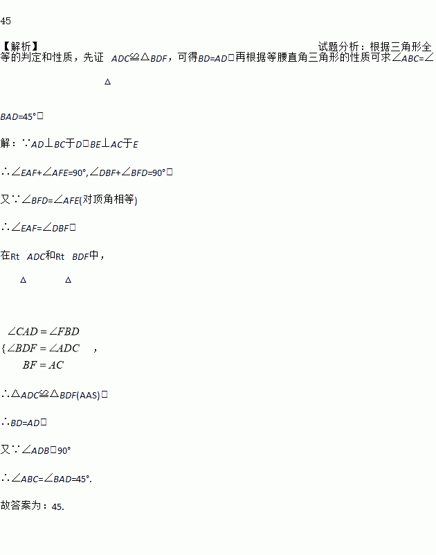 Èçͼ£¬ÔÚ¡÷ABCÖУ¬AD¡ÍBCÓÚD£¬BE¡ÍACÓÚE£¬ADÓëBEÏཻÓÚµãF£¬ÈôBF=AC£¬Ôò¡ÏABC£½______¶È£®