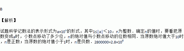 受“乡村旅游第一市”的品牌效应和2015年国际乡村旅游大会的宣传效应的影响,2016年湖州市在春节黄金周期间共接待游客约2800000人次,同比增长约56%,将2800000用科学记数法表示应是( )