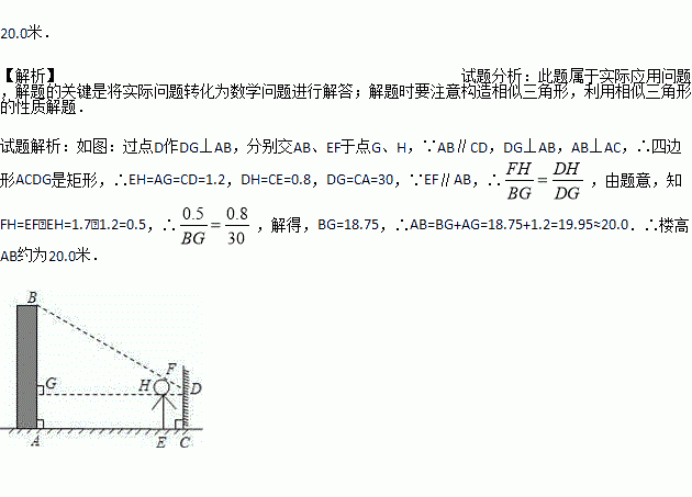 小明想利用太阳光测量楼高,他带着皮尺来到一栋楼下,发现对面墙上有这栋楼的影子,针对这种情况,他设计了一种测量方案,具体测量情况如下:如示意图,小明边移动边观察,发现站到点E处时,可以使自己落在墙上的影子与这栋楼落在墙上的影子重叠,且高度恰好相同.此时,测得小明落在墙上的影子高度CD=1.2m,CE=0.8m,CA=30m(点A、E、C在同一直线上).已知小明的身高EF是1.7m,请你帮小明求出楼高AB(结果精确到0.1m).