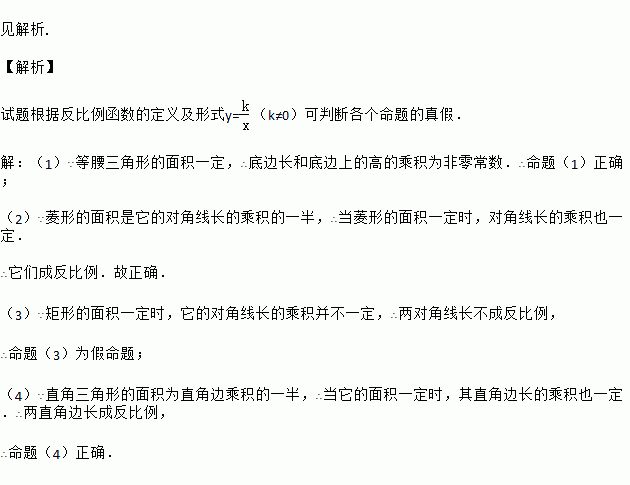 给出下列四个关于是否成反比例的命题,判断它们的真假.