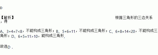 A. 3、4、8 B. 5、6、11 C. 6、8、20 D. 5、6、10