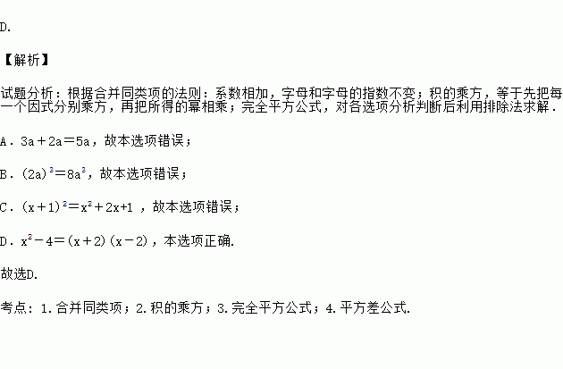 D. 【解析】 试题分析:根据合并同类项的法则:系数相加,字母和字母的指数不变;积的乘方,等于先把每一个因式分别乘方,再把所得的幂相乘;完全平方公式,对各选项分析判断后利用排除法求解. A.3a+2a=5a,故本选项错误; B.(2a)3=8a3,故本选项错误; C.(x+1)2=x2+2x+1 ,故本选项错误; D.x2-4=(x+2)(x-2),本选项正确....