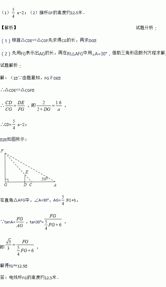 (1)若旗杆的高度FG是a米,用含a的代数式表示DG.