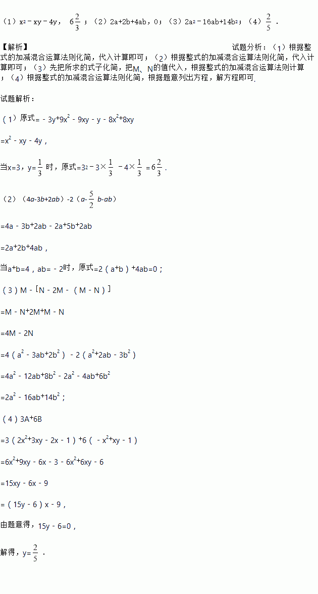 (1)x2﹣xy﹣4y, ;(2)2a+2b+4ab,0;(3)2a2﹣16ab+14b2;(4). 【解析】试题分析:(1)根据整式的加减混合运算法则化简,代入计算即可;(2)根据整式的加减混合运算法则化简,代入计算即可;(3)先把所求的式子化简,把M、N的值代入,根据整式的加减混合运算法则计算;(4)根据整式的加减混合运算法则化简,根据题意列出方程,解方程即可. 试题解析: ...