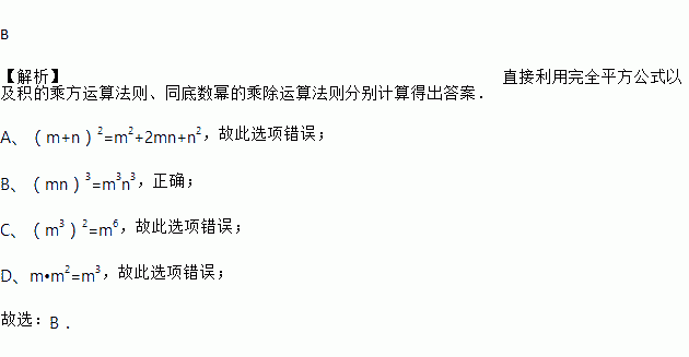 A. (m+n)2=m2+n2 B. (mn)3=m3n3 C. (m3)2=m5 D. m•m2=m2