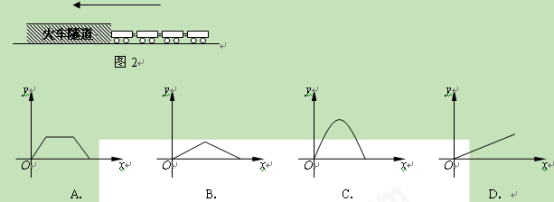 (2011贵州六盘水,7,3分)如图2,火车匀速通过隧道(隧道长等于火车长)时,火车进入隧道的时间x与火车在隧道内的长度y之间的关系用图像描述大致是( )