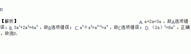D 【解析】A. a+2a=3a ,故A选项错误;B. 3a3•2a2=6a5 ,故B选项错误; C. a8÷a2=a8-2=a6 ,故C选项错误; D. (2a)3=8a3 ,正确,故选D.