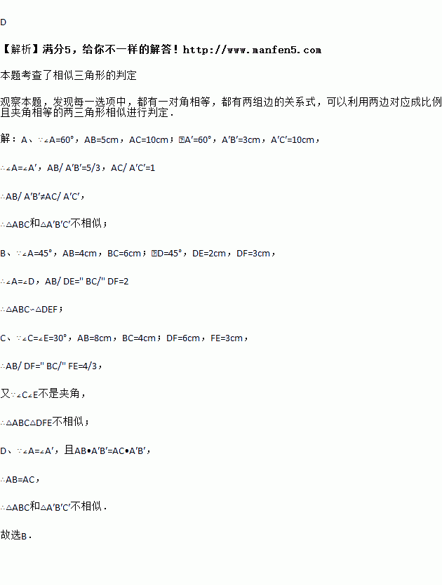 A. ∠A=60°,AB=5cm,AC=10cm;∠A′=60°,A′B′=3cm,A′C′=10cm