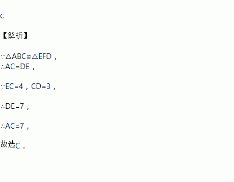 如图,△ABC≌△EFD,且AB=EF,EC=4,CD=3,则AC等于( )