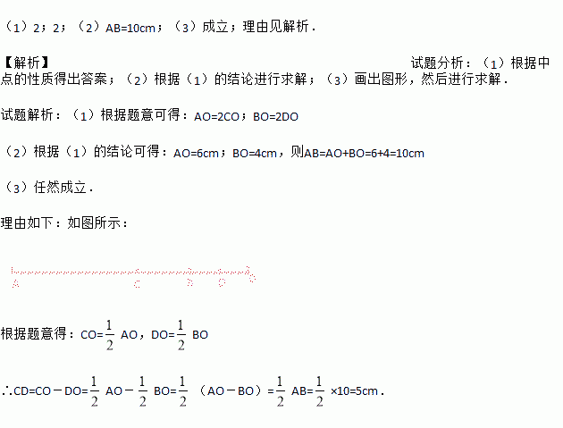 (3)若线段AB=10,小明很轻松地求得CD=5.他在反思过程中突发奇想:若点O在线段AB的延长线上,原有的结论“CD=5”是否仍然成立呢?请帮小明画出图形分析,并说明理由.