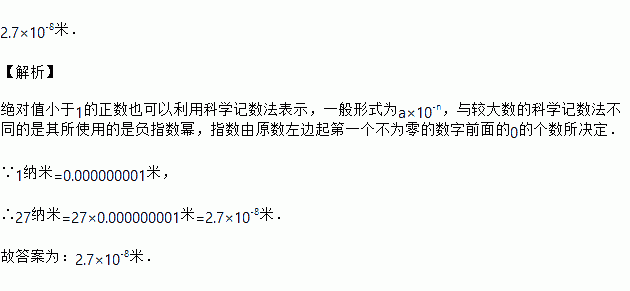 已知1纳米米,则27纳米用科学记数法表示为______.