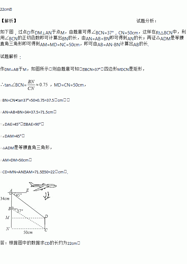 某飞机模型的机翼形状如图所示,其中AB∥DC,∠BAE=90°,根据图中的数据求CD的长?(精确到1cm)(参考数据:sin37°≈0.60,cos37°≈0.80,tan37°≈0.75)