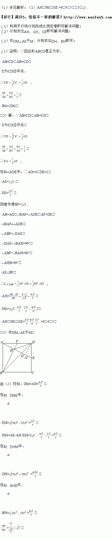 已知:正方形ABCD中,AB=4,E为CD边中点,F为AD边中点,AE交BD于G,交BF于H,连接DH.