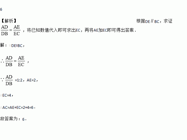 如图,在△ABC中,点D、E分别在AB、AC边上,DE∥BC,若AD:DB=1:2,AE=2,则AC=________ .