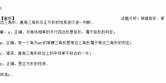 C 【解析】试题分析:根据矩形、等边三角形、直角三角形及正方形的性质进行逐一判断. 【解析】 A、正确,对角线相等的平行四边形是矩形,属于矩形的判定; B、正确,有一个角为60°的等腰三角形是等边三角形属于等边三角形的判定; C、错误,直角三角形斜边上的中线等于斜边的一半; D、正确,是正方形的性质. 故选C.