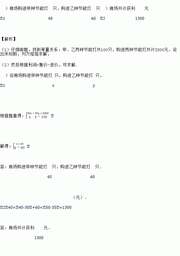 为了响应市委和市政府“绿色环保,节能减排”的号召,幸福商场用3300元购进甲、乙两种节能灯共计100只,很快售完.这两种节能灯的进价、售价如下表: