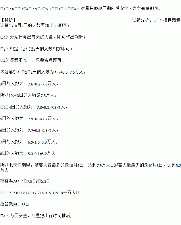 (1)7.8;(2)4,7.9,8,5.2;(3)55;(4)尽量把参观日期向后安排(言之有理即可) 【解析】试题分析:(1)根据题意计算出10月2日的人数再加上0.6即可; (2)分别计算出每天的人数,即可作出判断; (3)根据(2)把8天的人数相加即可; (4)答案不唯一,只要合理即可. 试题解析:(1)2日的人数为:7+0.6=7.6万人, 3日的人数为:...