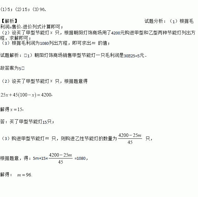 (1)5;(2)15;(3)96. 【解析】试题分析:(1)根据毛利润=售价-进价列式计算即可; (2)设买了甲型节能灯只,根据朝阳灯饰商场用了4200元购进甲型和乙型两种节能灯列出方程,求解即可; (3)根据毛利润为1080列出方程,即可求出的值; 试题解析:(1)朝阳灯饰商场销售甲型节能灯一只毛利润是30﹣25=5元. 故答案为5; (2)设买了甲型节能灯只,根据题...
