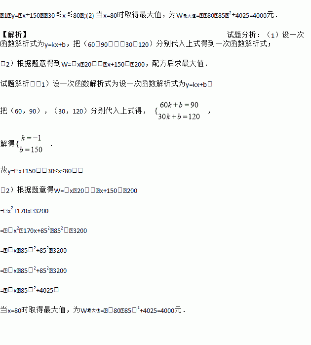 某贸易公司购进“长青”胶州大白菜,进价为每棵20元,物价部门规定其销售单价每棵不得超过80元,也不得低于30元.经调查发现:日均销售量y(棵)与销售单价x(元/棵)满足一次函数关系,并且每棵售价60元时,日均销售90棵;每棵售价30元时,日均销售120棵.
