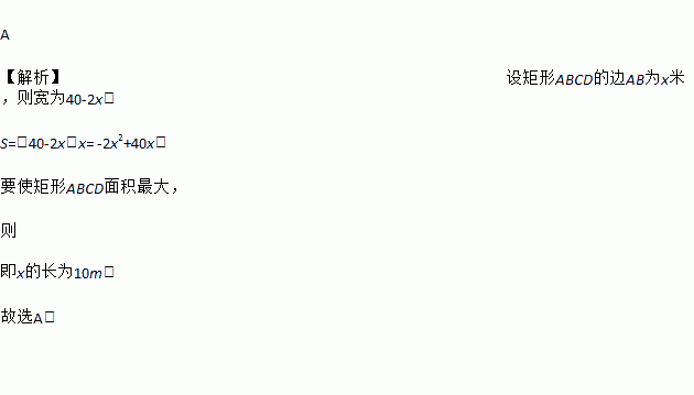 如图,一边靠校园围墙,其他三边用总长为40米的铁栏杆围成一个矩形花圃,设矩形ABCD的边AB为x米,面积为S平方米,要使矩形ABCD面积最大,则x的长为( )