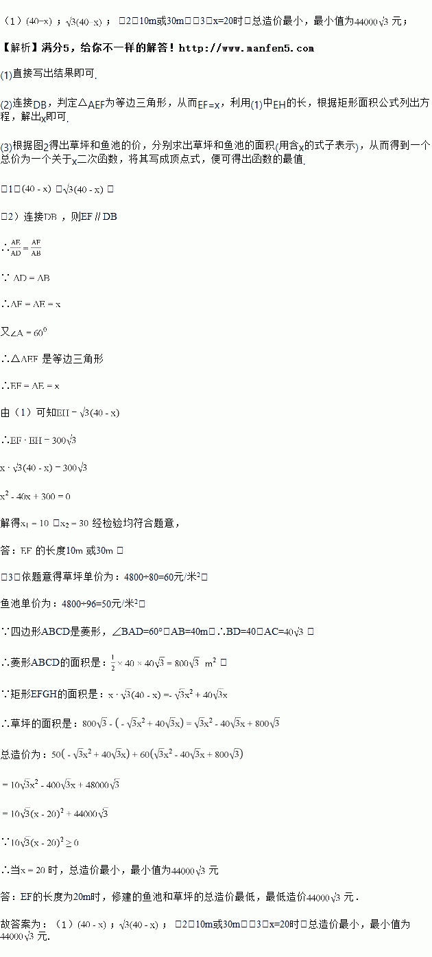 (3)EF的长度为多少时,修建的鱼池和草坪的总造价最低,最低造价为多少元?