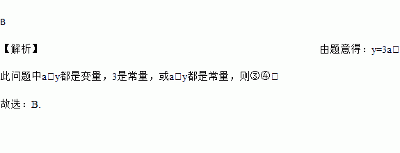 B 【解析】由题意得:y=3a, 此问题中a、y都是变量,3是常量,或a,y都是常量,则③④, 故选:B.