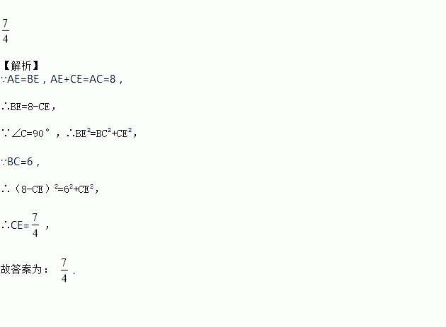 如图,直角三角形纸片的两直角边长分别为6,8,现将△ABC如图那样折叠,使点A与点B重合,折痕为DE,则CE的长是_______.