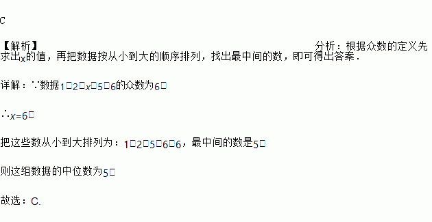 如果一组数据1、2、x、5、6的众数是6,则这组数据的中位数是( )