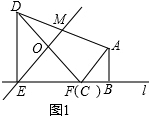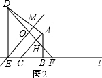 16.数学课上,张老师出示图1和下面框中条件:如图1,两块等腰直角三角板ABC和DEF有一条边在同一条直线l上,∠ABC=∠DEF=90°,AB=1,DE=2.将直线EB绕点E逆时针旋转45°,交直线AD于点M.将图1中的三角板ABC沿直线l向右平移,设C、E两点间的距离为x.(1)如图2所示,当点C与点F重合时,求$\frac{DM}{AM}$的值;