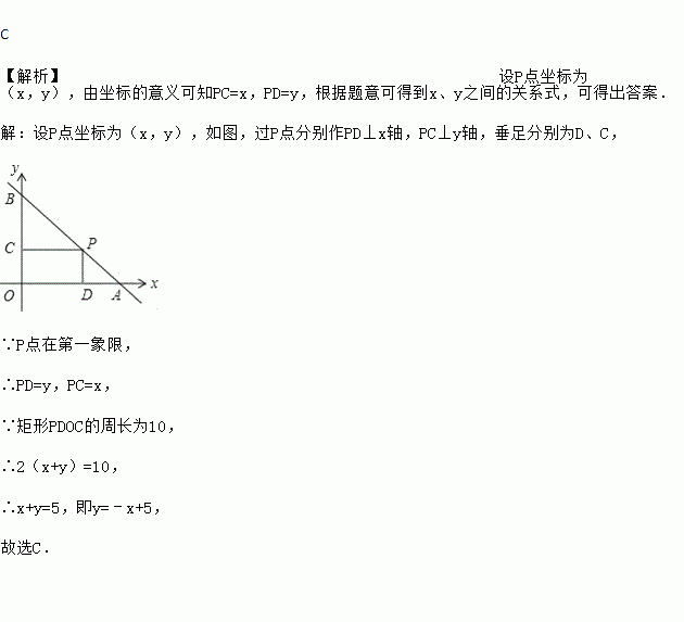 C 【解析】设P点坐标为(x,y),由坐标的意义可知PC=x,PD=y,根据题意可得到x、y之间的关系式,可得出答案. 【解析】 设P点坐标为(x,y),如图,过P点分别作PD⊥x轴,PC⊥y轴,垂足分别为D、C, ∵P点在第一象限, ∴PD=y,PC=x, ∵矩形PDOC的周长为10, ∴2(x+y)=10, ∴x+y=5,即y=﹣x+5, 故选...