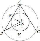 8.等腰三角形的三边长分别为10、10、12,则其内心与外心的距离为$\frac{5}{4}$.分析 过点A作AH⊥BC于H,根据角平分线的性质可得BH=CH,AH平分∠BAC,从而得到△ABC的外心O及内心I都在AH上.设△ABC外接圆的半径为R,内切圆的半径为r,连接IE、BI、OB,如图,在Rt△AHB中运用勾股定理可求出AH,在Rt△OHB中运用勾股定理可求出R,然后运用面积法可求出r,即可解决问题.