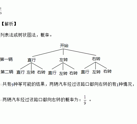 如右图,在某十字路口,汽车可直行、可左转、可右转.若这三种可能性相同,则两辆汽车经过该路口都向右转的概率为