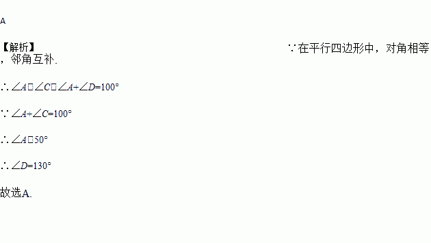 在平行四边形ABCD中,∠A+∠C=100°,则∠D= ( )