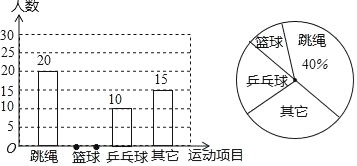 某县教育局为了丰富初中学生的大课间活动,要求各学校开展形式多样的阳光体育活动.某中学就“学生体育活动兴趣爱好”的问题,随机调查了本校某班的学生,并根据调查结果绘制成如下的不完整的扇形统计图和条形统计图: