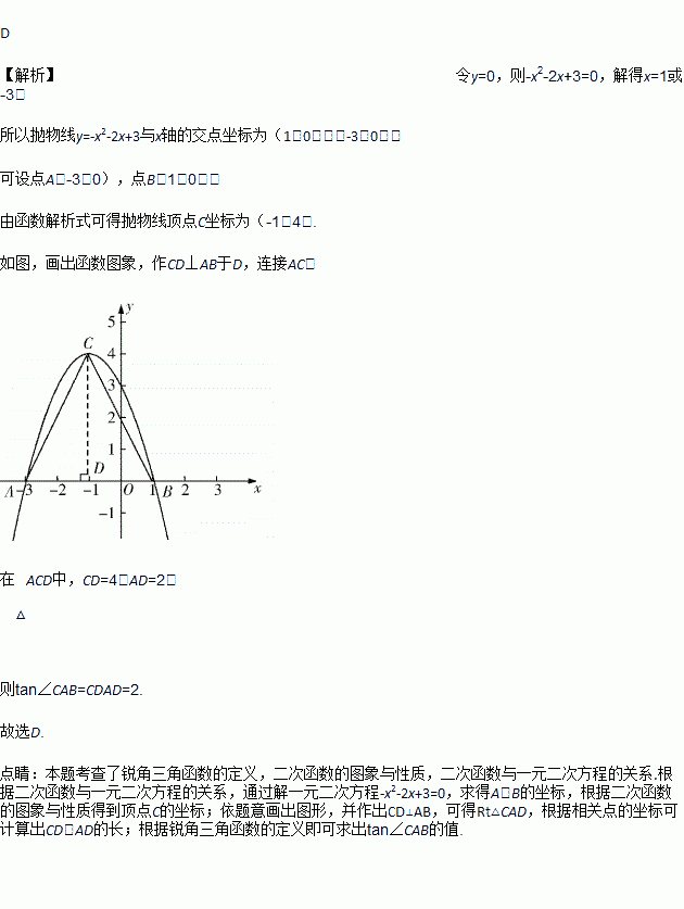 已知抛物线y=-x2-2x+3与x轴交于A,B两点,将这条抛物线的顶点记为C,连接AC,BC,则tan∠CAB的值为( )