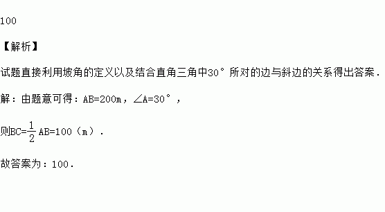 如图所示,小明从坡角为30°的斜坡的山底(A)到山顶(B)共走了200米,则山坡的高度BC为 米.